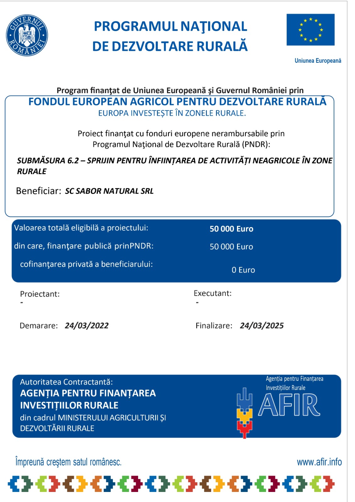 PROGRAMUL NAŢIONAL DE DEZVOLTARE RURALĂ: Program finanţat de Uniunea Europeană şi Guvernul României prin FONDUL EUROPEAN AGRICOL PENTRU DEZVOLTARE RURALĂ EUROPA INVESTEȘTE ÎN ZONELE RURALE. Proiect finanţat cu fonduri europene nerambursabile prin Programul Naţional de Dezvoltare Rurală (PNDR): “DEZVOLTARE MRM 4FUN COMPANY”, in localitatea Ocna Sugatag, Judetul MARAMURES. Beneficiar: SC MRM 4FUN COMPANY SRL . Valoarea totală eligibilă a proiectului: 50.000 Euro din care, finanţare publică prin PNDR: 50.000 Euro și cofinanţarea privată a beneficiarului: 0 Euro.Demarare: 01/06/2022; Finalizare: 31/12/2023. Autoritatea Contractantă: AGENȚIA PENTRU FINANȚAREA INVESTIȚIILOR RURALE PROGRAMUL NAŢIONAL DE DEZVOLTARE RURALĂ https://www.afir.info/ . Proiect finanţat cu fonduri europene nerambursabile prin Programul Naţional de Dezvoltare Rurală (PNDR): din cadrul Ministerului Agriculturii și Dezvoltării Rurale.
